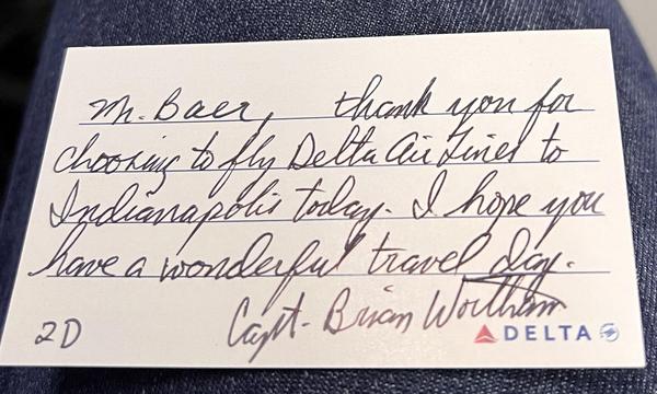 This card from Captain Brian was sitting on my seat when I plopped down on yet another Atlanta >>> Indianapolis flight. Looking around, every seat in the first five rows had a card.